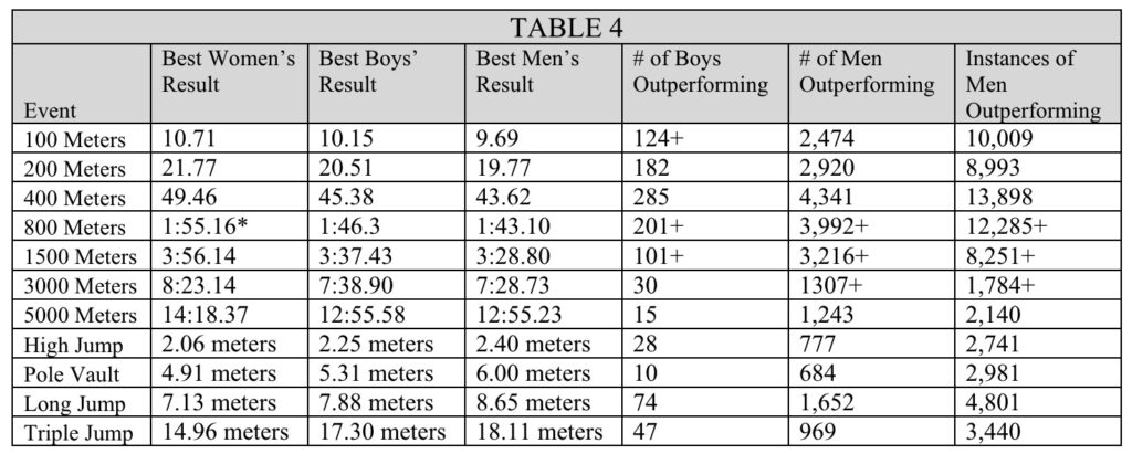 “The number of men and boys beating the world’s best women in the 100 and 400 meters is far from the exception,” the authors write. “It’s the rule.”