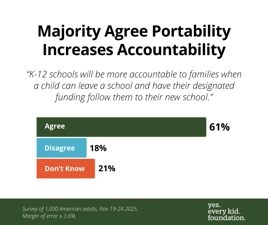 The poll also found 76% of parents believe schools should be more accountable to parents, and 61% say schools will be more accountable to families once parents can easily take their child out of that school.