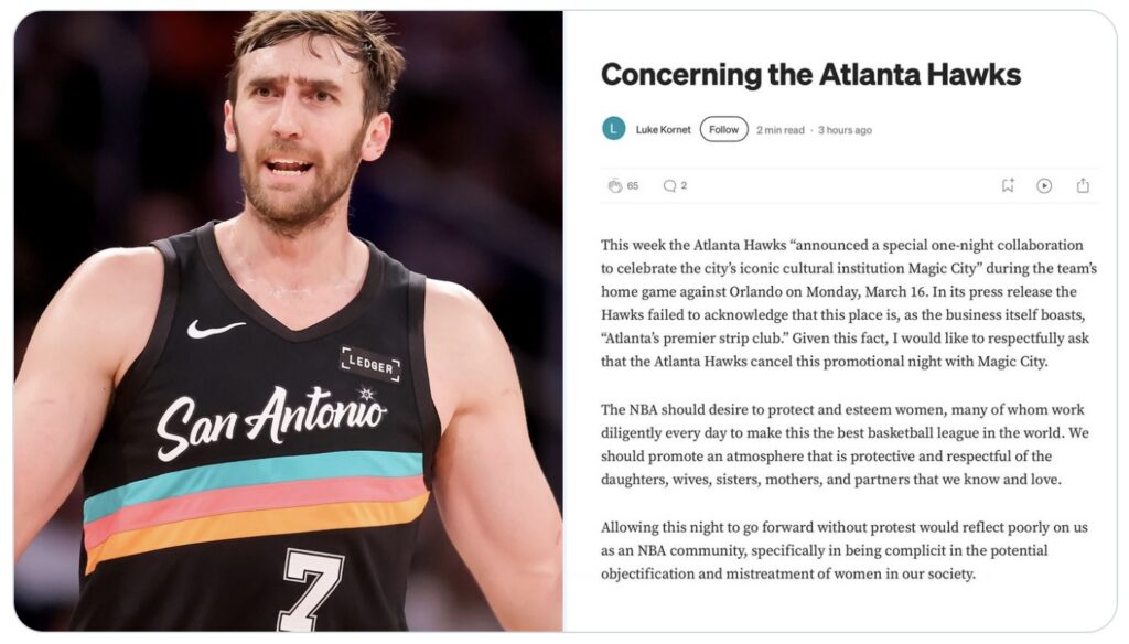“In its press release the Hawks failed to acknowledge that this place is, as the business itself boasts, ‘Atlanta’s premier strip club,’” Kornet wrote in a Medium blog. “Given this fact, I would like to respectfully ask that the Atlanta Hawks cancel this promotional night with Magic City.
