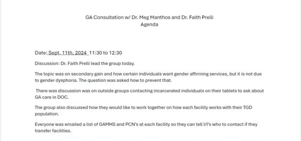 Other topics of the monthly meeting included discussions on “big changes” that could result from the November 2024 election and outside groups who were contacting inmates about gender “affirming care” in the DOC, documents show.