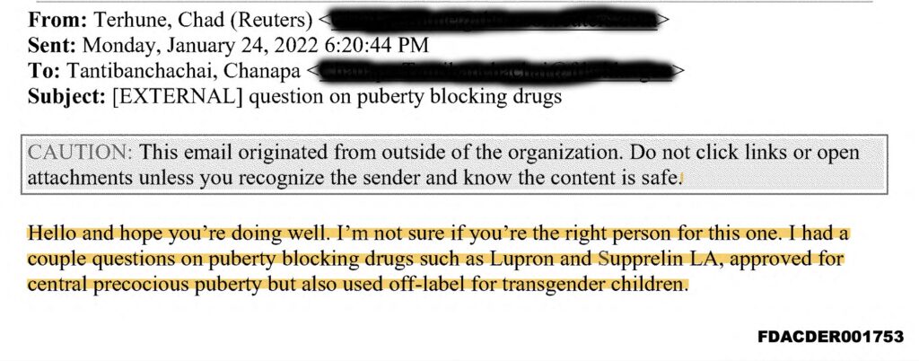 Sullivan originally sent the email as FDA staff discussed how to respond to a media request from Reuters reporter Chad Terhune. Terhune had asked about “puberty blocking drugs,” noting that such drugs have been “approved for central precocious puberty but [are] also used off-label for transgender children.”