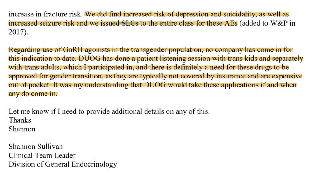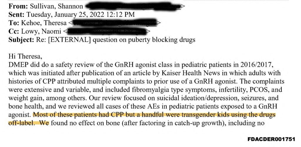 In one email on Jan. 25, 2022, Shannon Sullivan, clinical team leader at the FDA’s Division of General Endocrinology, noted that the agency’s Division of Metabolism and Endocrinology Products performed a “safety review of the GnRH agonist class in pediatric patients in 2016/2017.” GnRH stands for “Gonadatropin-releasing hormone,” and GnRH agonists prevent the natural release of testosterone and estrogen that initiate puberty.