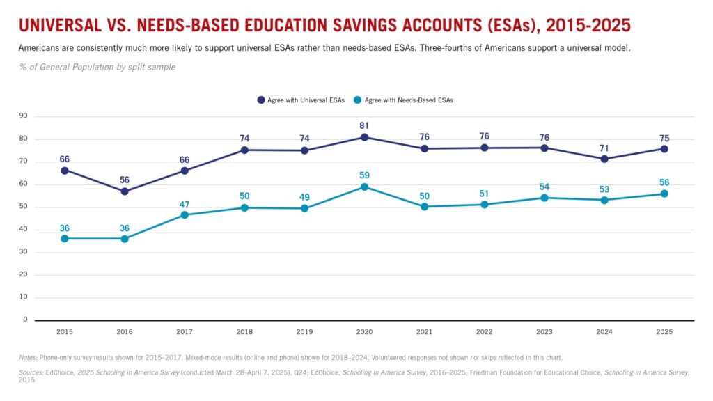 Support for universal ESAs was 75%, versus 56% for ESAs restricted by income or for special needs students, indicating Americans prefer programs available to all students. Universal school choice has proliferated in recent years, with 18 states offering or starting programs that are open to all residents.