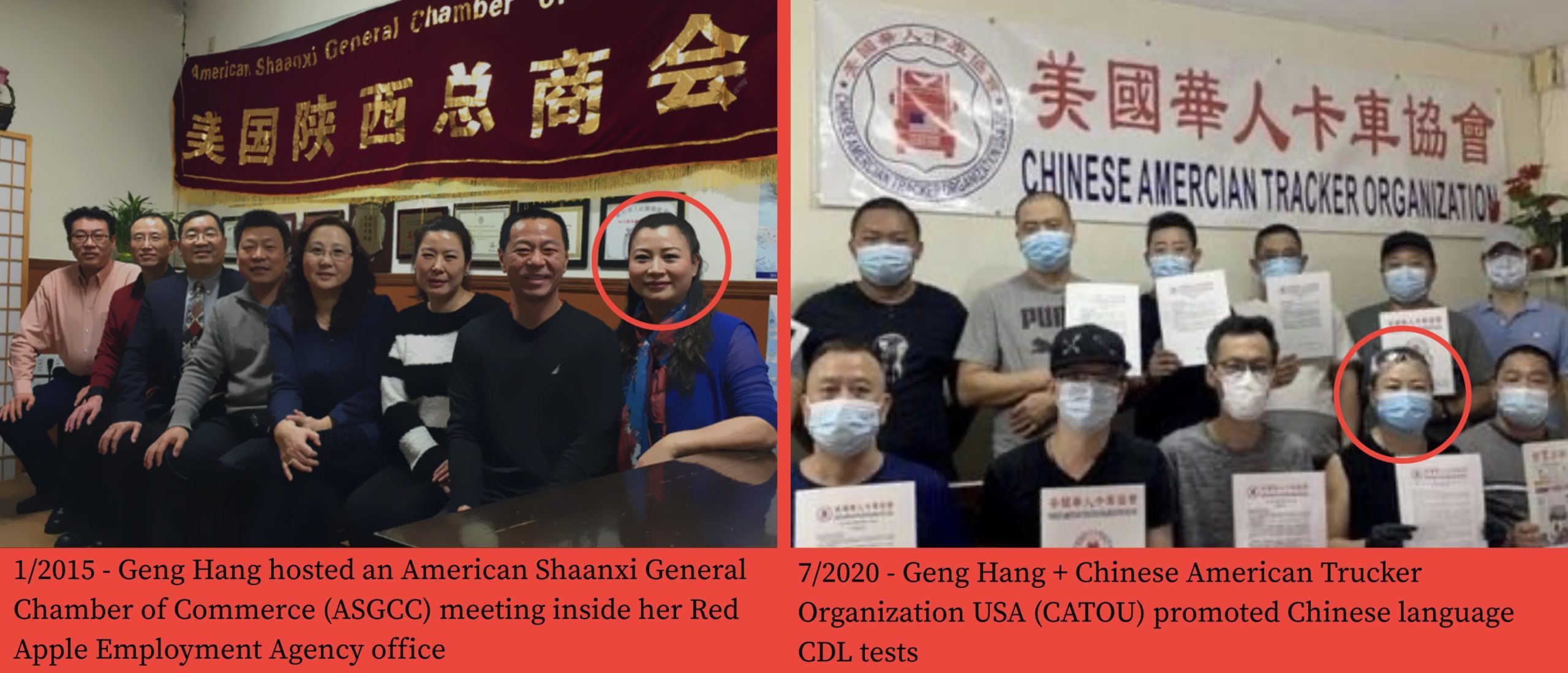 The public safety concern presented by truckers with unknown criminal backgrounds and driving records is compounded by CATOU’s board chairwoman, Geng Hang, who has held leadership roles within organizations operating as arms of the Chinese government and a Chinese Communist Party (CCP) influence and intelligence agency called the United Front Work Department (UFWD), according to DCNF translations of announcements from those entities.