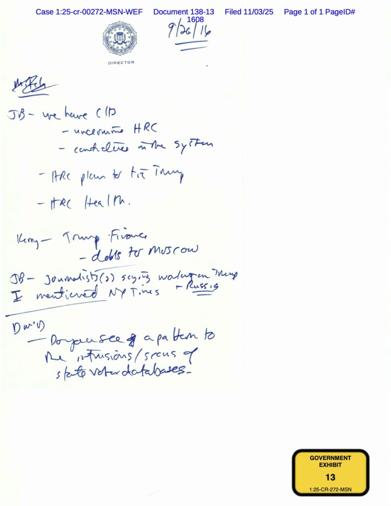 Comey scrawled the note, included as an exhibit in the legal docket, under an emblem showing that it originated from the FBI director’s desk. The note bears the date Sept. 26, 2016, which was 19 days after Comey received a Sept. 7, 2016 investigative referral regarding a plan by Hillary Clinton’s campaign to tie Donald Trump, her rival in that year’s presidential race, to Russia, as she sought to divert attention from her use of a private email server.