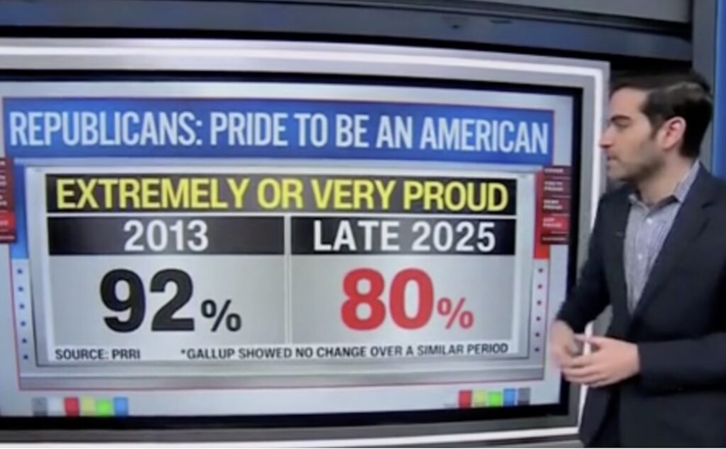 Democrats’ pride in their American identity dropped from 83% in 2013 to 31% in late 2025, Enten said while citing a PPRI survey. A majority of Republicans, 80%, were still “extremely or very proud” to be American as of late 2025, a 12-point drop from 2013.
