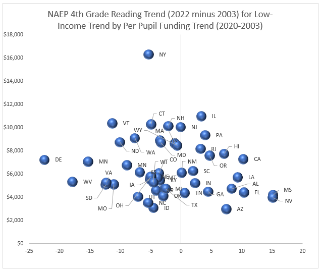 Basically, you want to see your state on the right side of the zero line on this chart that plots the literacy trend against a spending increase per pupil.