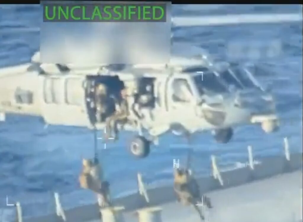 At Thursday’s briefing, White House press secretary Karoline Leavitt said the DOJ obtained a warrant for Wednesday’s operation because the vessel was “a sanctioned shadow vessel known for carrying black-market oil” for Iran’s Islamic Revolutionary Guard Corps (IRGC).