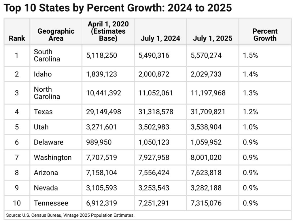 South Carolina was the fastest-growing state last year, increasing its population by 1.5%. Neighboring North Carolina ranked third at 1.3%, with Idaho (1.4%), Texas (1.2%) and Utah (1%) rounding out the top five.