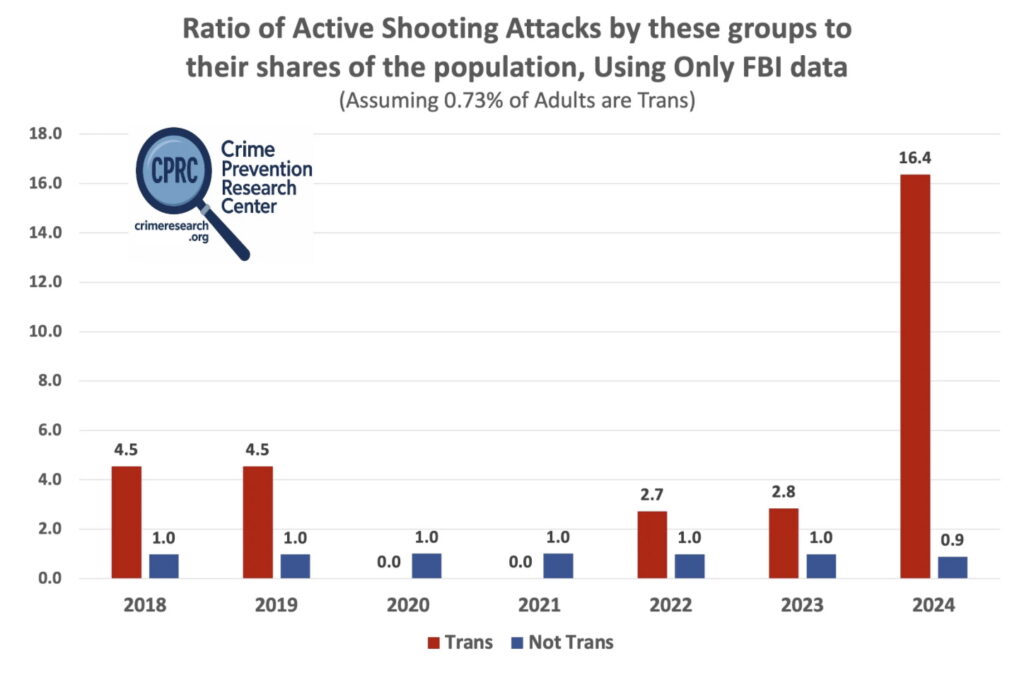 “In 2024 transgender individuals committed active shooting attacks at least 12 times their share of the population and possibly more than 16 times their share,” the Crime Prevention Research Center concluded.
