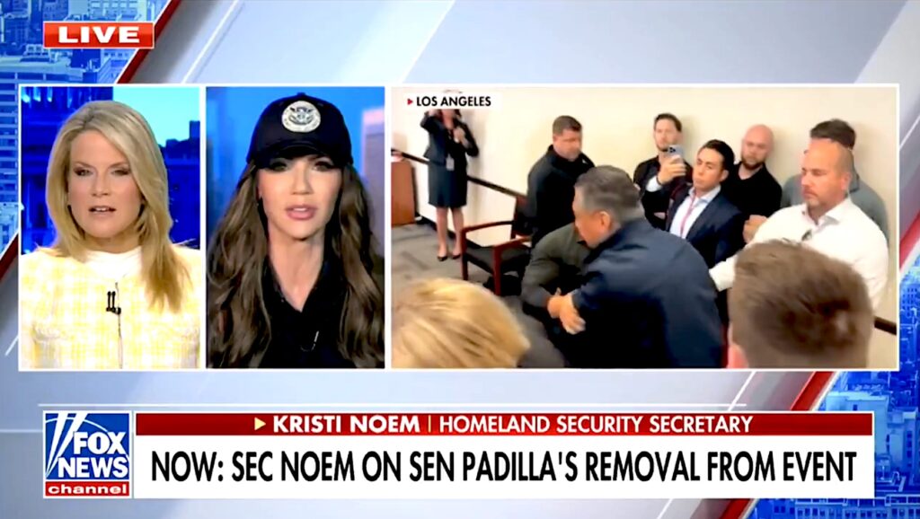 Homeland Security Secretary Kristi Noem told Fox News that California Sen. Alex Padilla was forcibly removed from her press briefing Thursday after he “burst into the room, started lunging toward the podium, interrupting me and elevating his voice.”