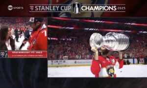 Dominick Critelli, sporting a number 104 Islanders jersey and a WWII veterans’ hat, walked to his chair and played the Star-Spangled Banner, inspiring chants of “USA.”