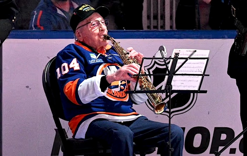 A 104-year-old World War II Army veteran hit every vibrant note of the National Anthem on his saxophone at a New York Islanders game Saturday.